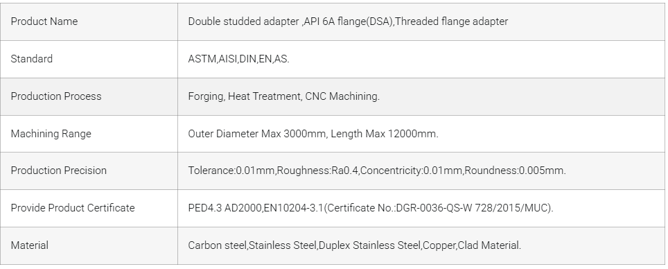 双螺柱适配器法兰(DSAF)或称双螺柱适配器(DSA)是一种法兰,具有贯孔和每侧环形槽,两侧均有钻孔和攻牙的螺栓孔,以及两侧均配有螺母的攻牙端柱。与垫片不同,两侧通常在尺寸和/或压力等级上不同。双螺柱适配器法兰常用于连接和调整具有不同标称尺寸、压力等级和配置的盲法兰。